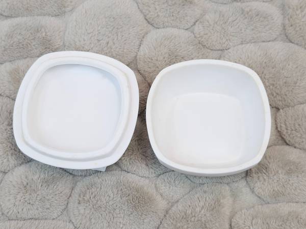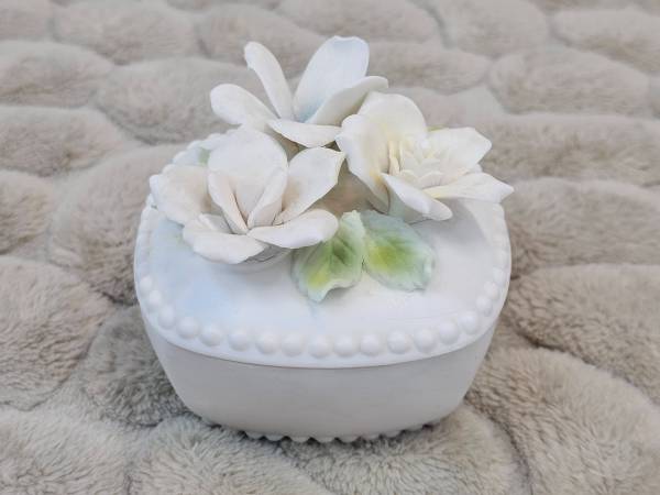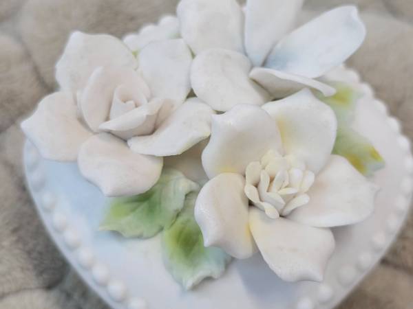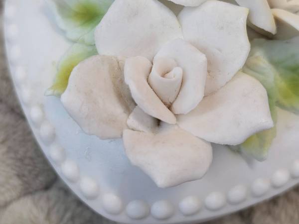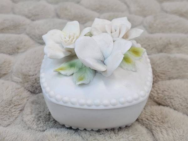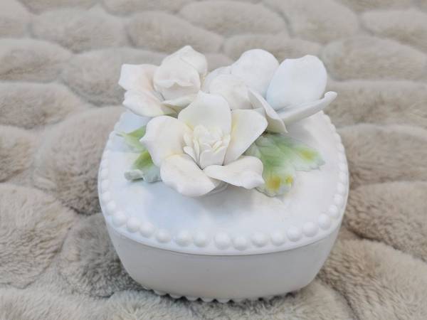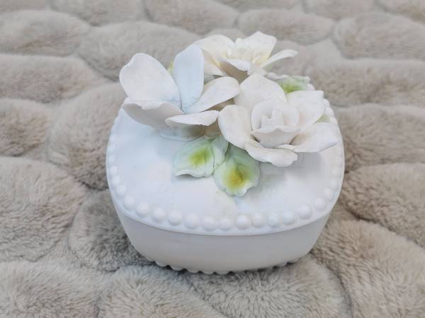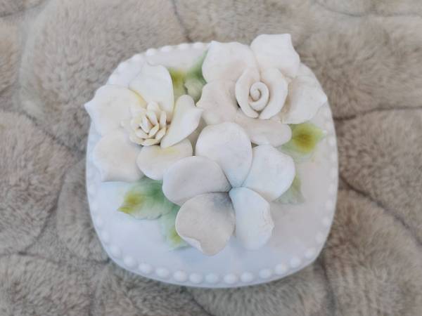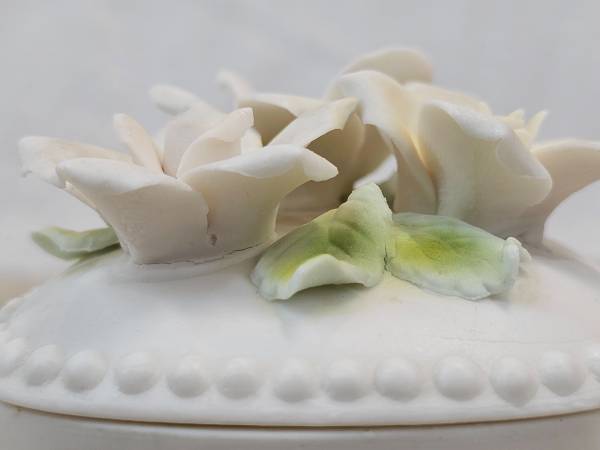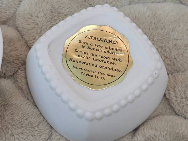 Adorable square bisque porcelain box made by Karen Carson Creations. This refreshener's lid is adorned with delicate flowers and the edge and base have a quaint beaded pattern. Karen Carson Creations is known for their bisque porcelain items. The decorative air fresheners, or "refresheners" were used to hold small candles, potpourri, or scented oils. This particular box held a candle with the faint hint of the delectable aroma still present when opened. Tag still on bottom. Excellent vintage condition.
