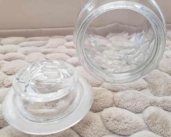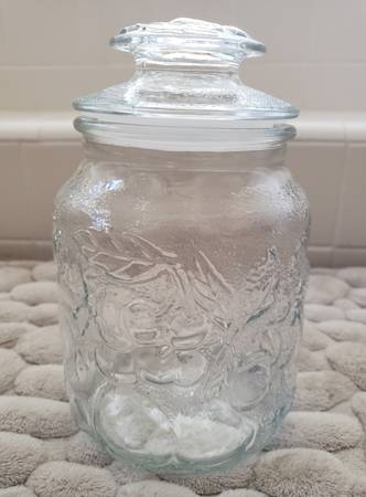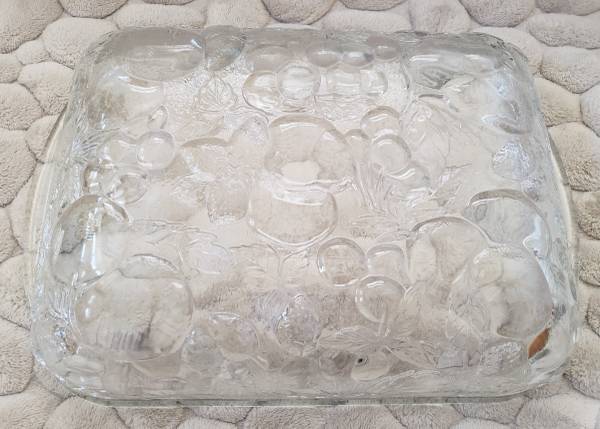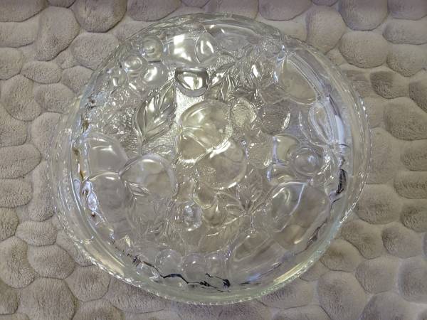 The photos don't really do these justice - they are quite lovely as the light refracts through the patterned design of the glass. Beautiful vintage clear raised fruit design. Manufactured 1997. Discontinued