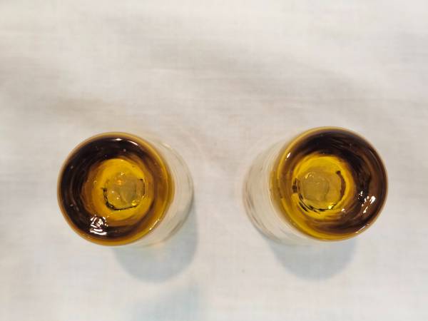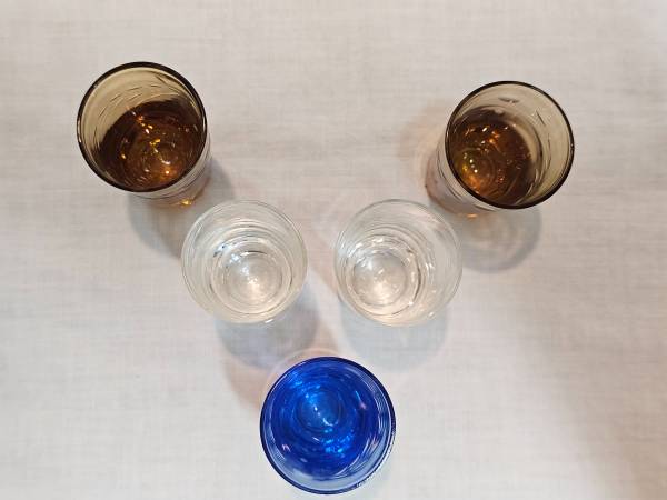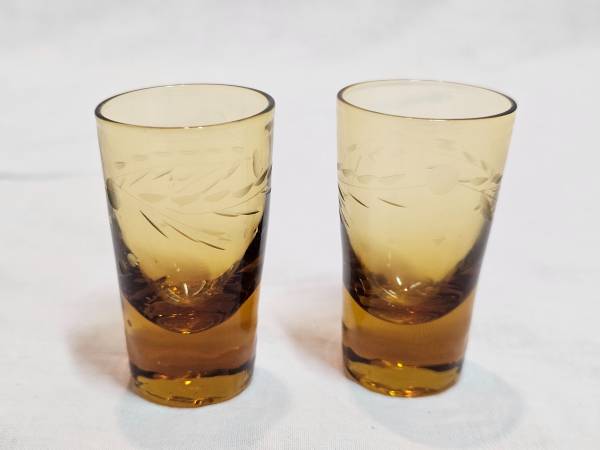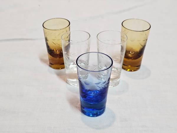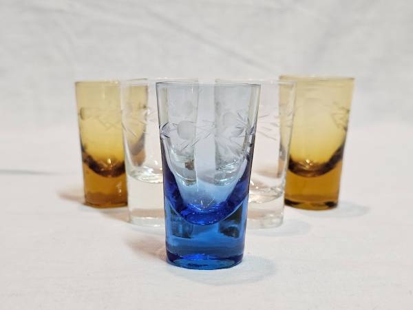 Vintage set of five multi-colored wheat etched cordial/shot glasses. Each glass stands at approximately 2.5 " tall by 1 3/8" upper rim diameter. There are three clear, two amber colored, and one blue. They feature an intricate etched wheat pattern that add a touch of elegance to any occasion. The glasses are made of high-quality glass material and appear to either be a mid-century modern style or could even be from the depression ere. They're the perfect addition for a retro-themed party, a classic home bar, or the glassware enthusiast/collector. NO CRACKS OR CHIPS! Excellent vintage condition!
