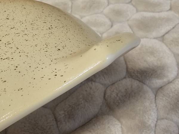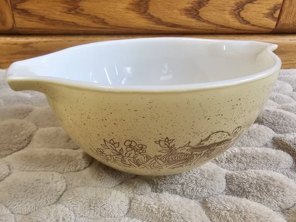 Adorable vintage Pyrex Forest Fancies Mushroom Cinderella Bowl 441 size, which is the smallest of the set and holds 750ml. It's part of a vintage collection first introduced in 1981 as a successor to the Homestead pattern. It was one of the last four Pyrex patterns to be manufactured before production ceased in 1986. This bowl is characterized by its beige color with a brown mushroom and foliage pattern, and the "Cinderella" design with tab handles for easy pouring. This particular bowl is 7 1/2 inches wide (from handle to handle) and 3 inches high. Excellent condition, some very small wear on the corners of the pour handles. Really nice vintage used condition.