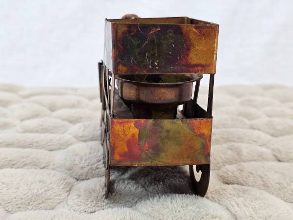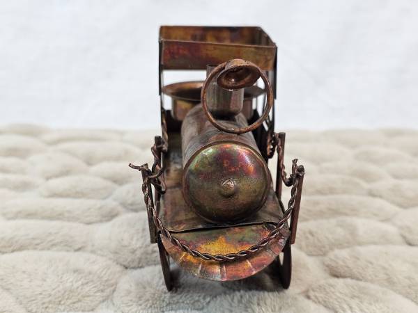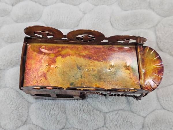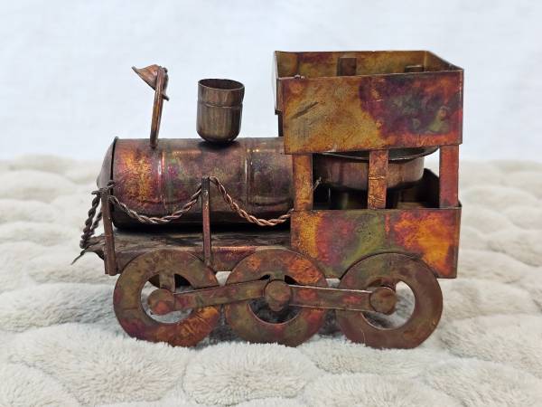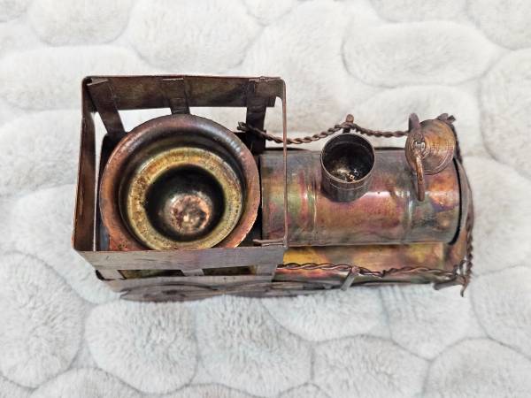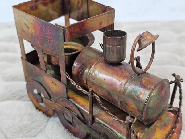 Vintage metal locomotive engine votive candle holder. A delightful metal sculpture that captures the essence of historical travel. Handcrafted in durable rainbow copper colored metal, this is a little engine that could endure the test of time. Perfect for collectors and enthusiasts of nostalgic décor. Add this touch of rustic elegance to your home and bring a slice of history along with!