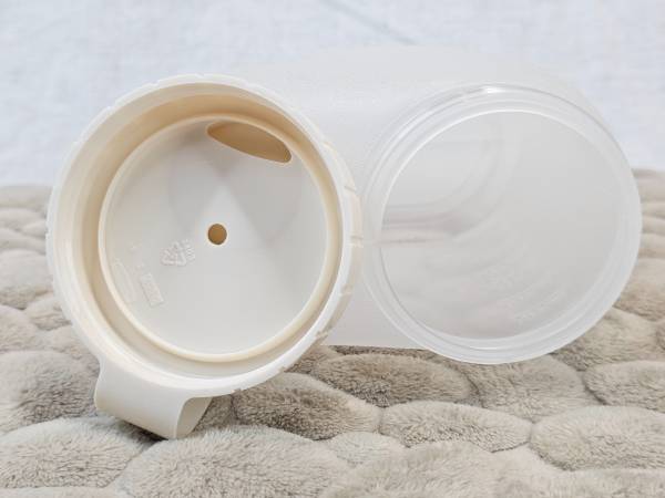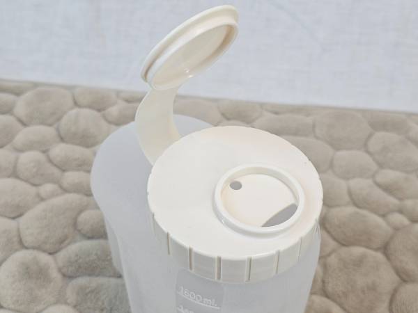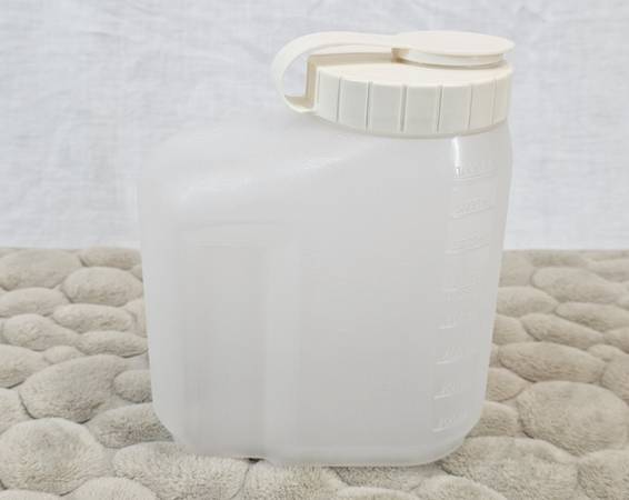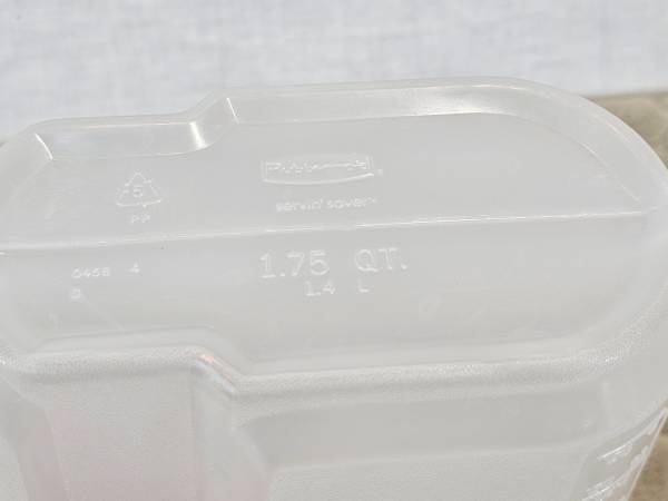 Rubbermaid Servin Saver pitcher jug holding 1.75 quarts / 1.4 Liter Beverage Pitcher Container / Water Bottle Jug with flip open lid. Sheer body with almond flip open lid, it measures 7 1/2 inches tall by 3 1/2 inches wide. There is a built-in handle on the side with measurement markings of up to 1600mL on one side and up to 1.75 Qt / 56 oz ounces on the other side. This is in excellent vintage condition showing little use! Dishwasher Safe