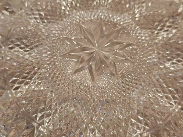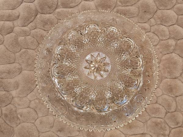 Discover a touch of elegance and nostalgia with the Vintage Indiana Glass Tiara Sandwich Glass Clear Chantilly Deviled Egg Tray. This 12" diameter plate is a beautiful and decorative piece. Crafted in America in the 1970s from high-quality glass, this round plate showcases the classic Chantilly pattern, adorned with the Tiara Sandwich pattern and a flower theme, its sparkle and flair adds a touch of elegance to any table setting, making it an ideal choice for all occasions. The cut glass production style make it a unique and eye-catching addition to any setting making it perfect for all occasions. Weighing in at 3.8 pounds and standing 1 inch tall, it ensures a substantial yet graceful presentation. To maintain its luster, hand washing is recommended for this unique item. Whether used for deviled eggs or as a standalone display piece, it brings a vintage charm to your home décor and is a must-have for collectors of Sandwich Glass and vintage dinnerware. I can feel small "flea bites" along the upper inner edge, but nothing substantial. Excellent used vintage condition.