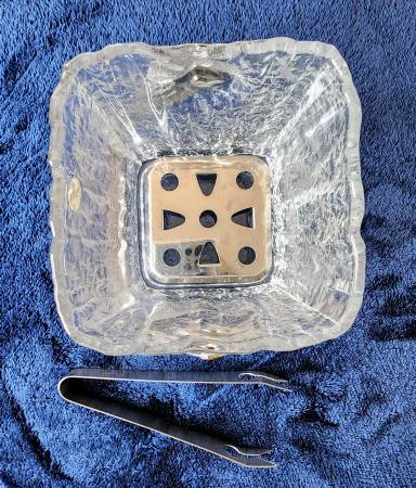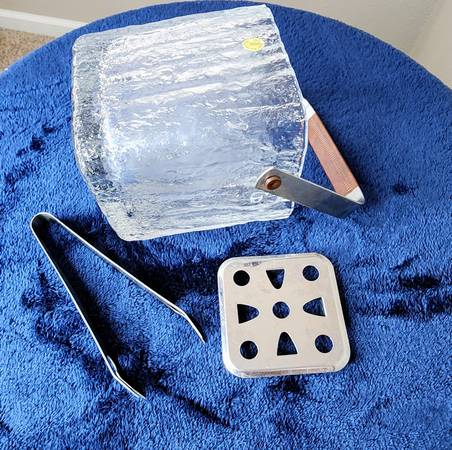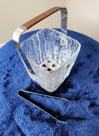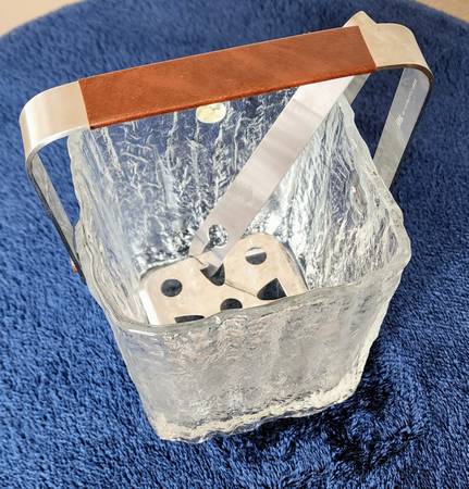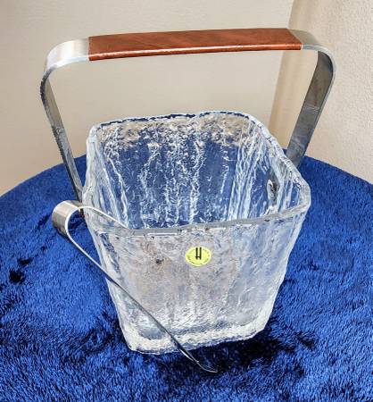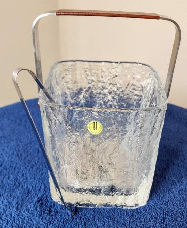This ice bucket was made of heavy, textured glass by Hoya. The set includes its original Stainless Steel handle (with brown accents), along with ice tongs and a rack that sits in the bottom of the bucket.