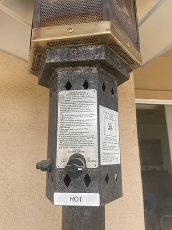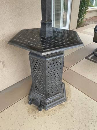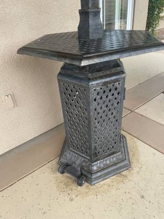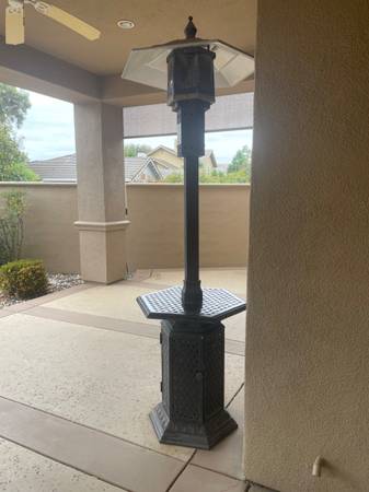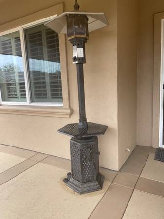 Here is a not so ordinary cast iron outdoor heater for your cool nites on the patio. Propane.