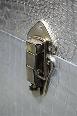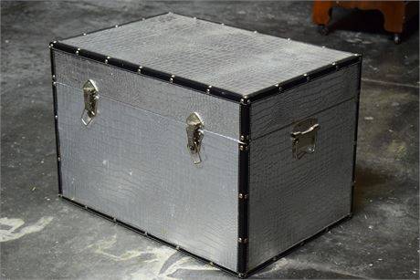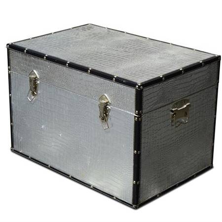 Bold metallic design on high quality textured vinyl. Matching hinges, closures, and rivets. Convenient internal arm holds lid open. Durable wooden construction reinforced with riveted edges. Spacious fabric lined interior. Made from canvas and spruce wood. Silver finish. 16 in. L x 24 in. W x 16 in. H (18 lbs.). This fine trunk chest is sure to be a unique addition to your home this trunk is ideal for fashionably expanding your existing storage space. Designed for your convenience, whether you are looking for extra storage or just add a splash of color to a room, this trunk is sure to be a lively addition to your decor.