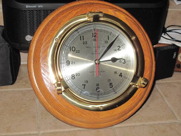 Bell Clock Company Port Hole wall clock available. Brass and Oak wood in pretty good condition. Quartz driven model is ready for use. Will include a battery to get you started. The clock itself is 8" across. With wood trim, 11" across. Actual item you see here. If interested, email/text/call me to see item. Here in South Sac. Thanks. Two7nine two2four Four3four Three.