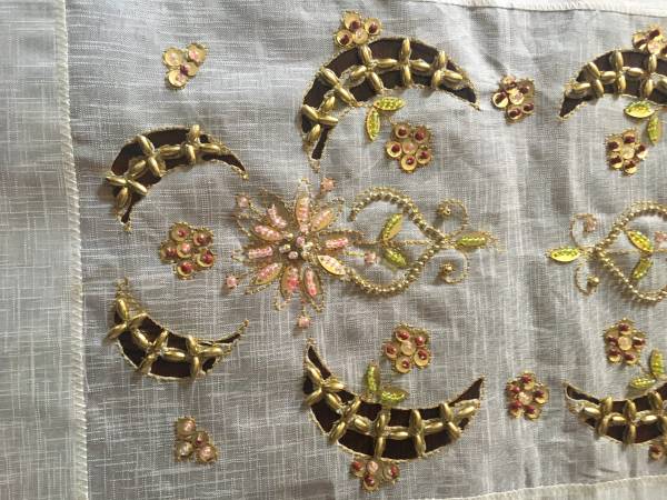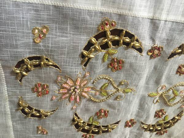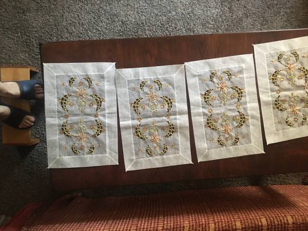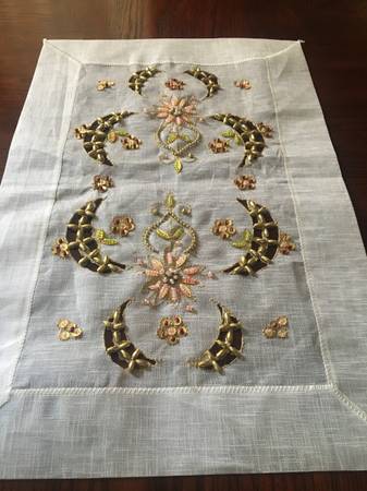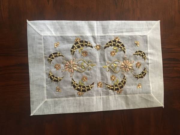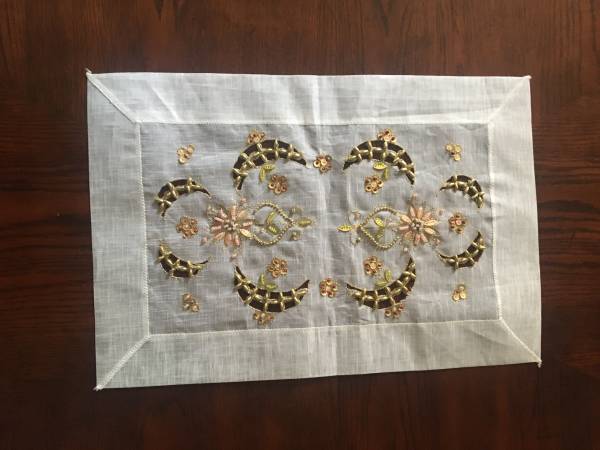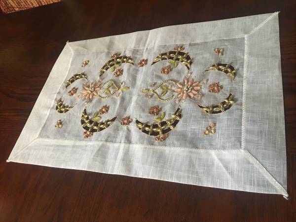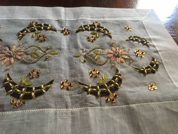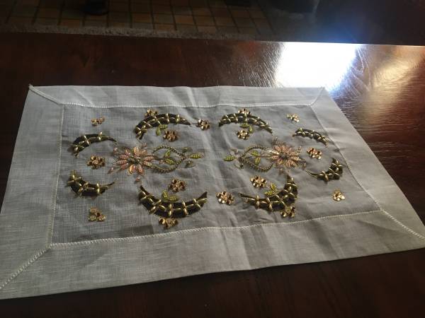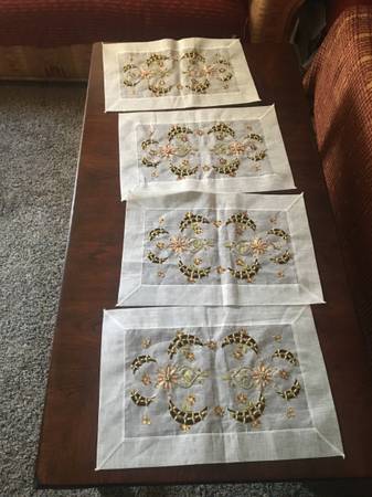 Organza placemats 12” x 18” - up to 4 available - buy one or buy all 4 for discount. Real highly decorated special occasion like baptism, wedding anniversary, birthday etc. Place setting, placemat, table runner centerpiece Highly intricately beaded pattern - vinelike swirls - multiple color brown and gold beads, shapes and sizes. Exquisite handicraft - so beautiful you may want to frame and hang on a wall