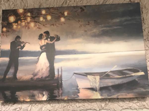 This gorgeous print is in excellent condition and so beautiful with the couple dancing next to a violin player and a boat in a lake. Love it, but I don't have the room for it - hoping someone else will enjoy it.