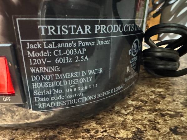 Jack LaLannes CL-003AP Power Juicer Black 600 RPM Motor Power Powerful 250 W Single Speed Dishwasher-safe Excellent working condition Pick up