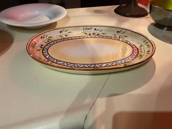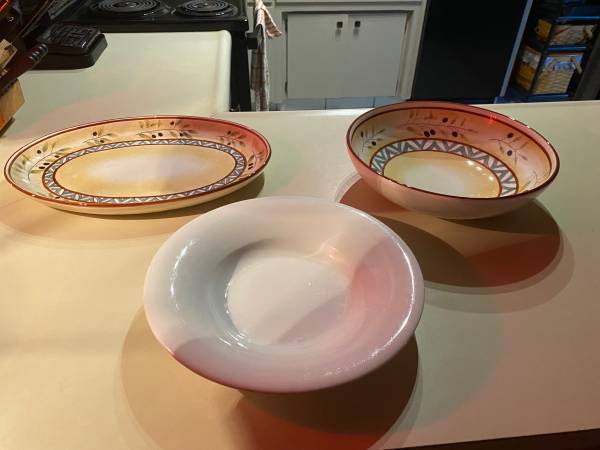 Selling this matching Large Bowl and Platter and extra Large Bowl for $20 or best offer. Matching set platter measures 16 1/2 in long x 11 1/2 in wide. Bowl is 12 1/2 in diameter x 4 in deep. Extra Large Bowl is 12 1/2 in diameter is 2 in deep. On Pocket Rd off Hiway 5, cash is best. Call text or email Irene show contact info