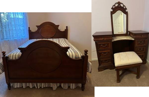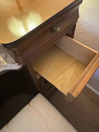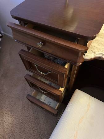 Dressing table has center marble top with mirror and includes bench. One drawer has a missing a slat but over wise in excellent condition.