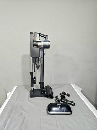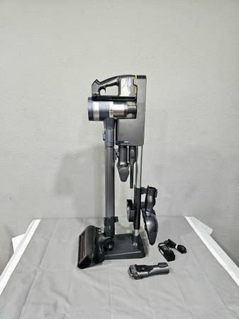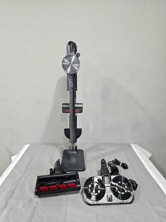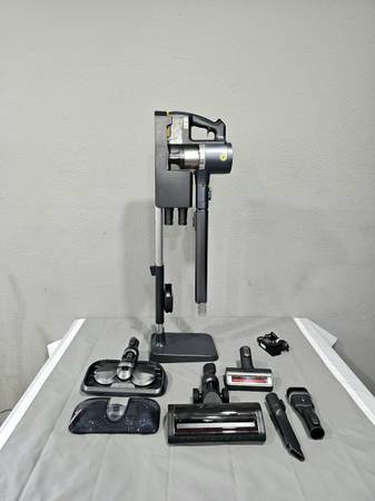 includes mopping attachment, motorized pet brush, two crevice/dusting tools, dual battery setup, and charging stand.