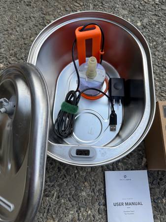 This plug-in water fountain, unlike it's competitors, is made of quality stainless steel. It holds 3 liters of water. We've provided extra filters, which are also available on Amazon. It sells new for $30.59. This unit is in excellent condition, has been cleaned, and works perfectly.