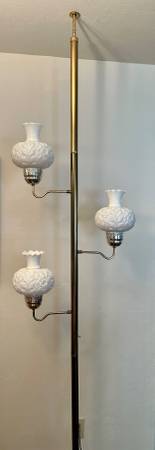 VINTAGE 1960s MID CENTURY MODERN WHITE MILK GLASS 3 LIGHT TENSION POLE LAMP FLOOR TO CEILING. 3 ADJUSTABLE LIGHT SETTINGS. $175