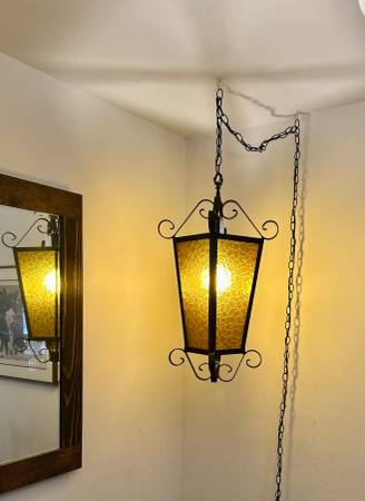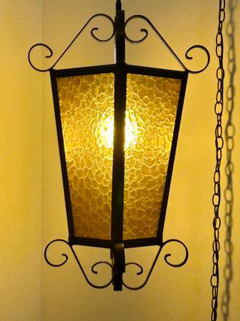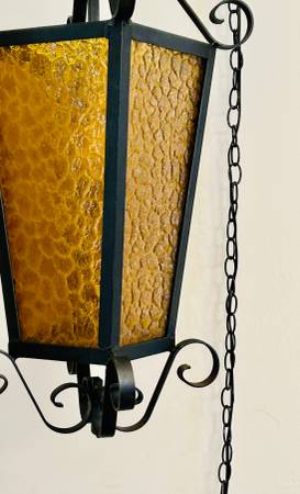 Vintage Mid-Century Modern Amber Glass and Iron Spanish Revival Gothic Chain Ceiling Swag Lamp / Light. LAMP ITSELF IS 25" TAL, 13" WIDE AT TOP, AND 10" WIDE AT IT'S BOTTOM. WEIGHS APPROX 7lbs with...