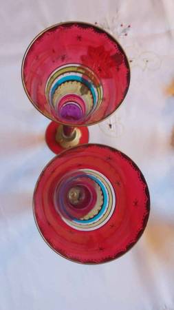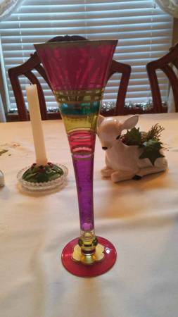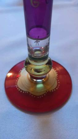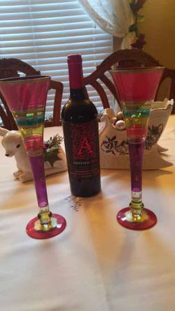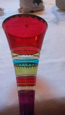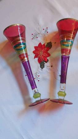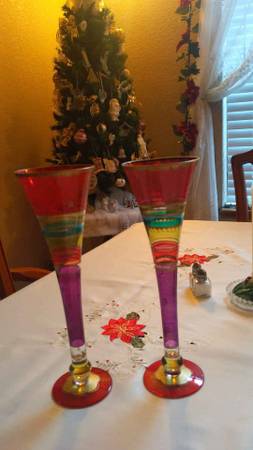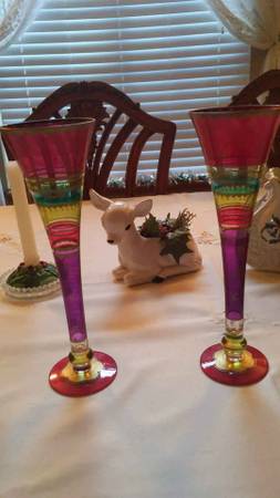 Festive Stripes Set of 2 Champagne Flutes Hollow Stem Hand Painted Bohemian Glass. Cash and local pick up please call