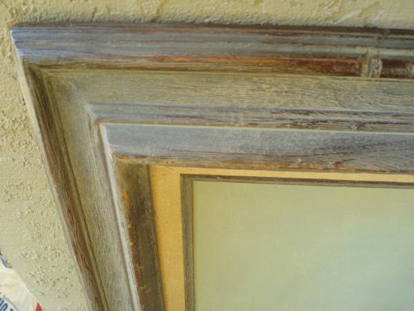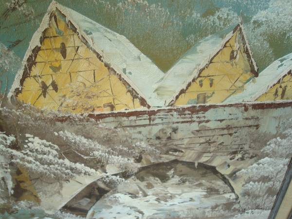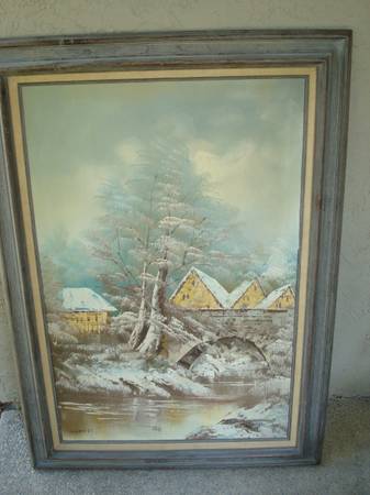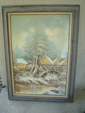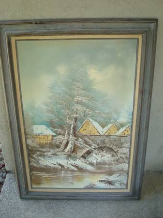 Beautiful landscape oil on canvas panting, winter scene of foot bridge over river, framed in nice looking rustic wood, measures 31.5” x 43.5”. Signed by artist Garrett. $200 obo