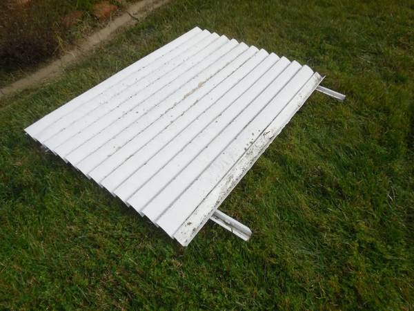 3 metal awnings in good condition. Each one same size: 39" H x 54" W. Arms are 39" long, but could be installed closer, as the arms are on hinges. New ones like this sell for $1000 for three. Structure and slats are in good condition. Can be mounted to fascia board or other support at top. Swing arms have holes to mount onto wall. $140 for all three, or $50 each for one or two.