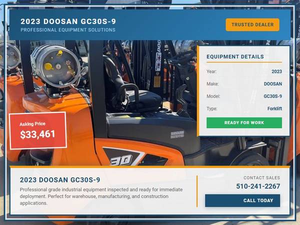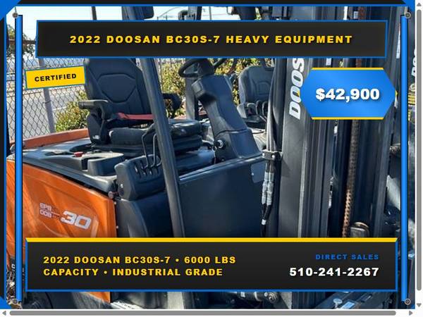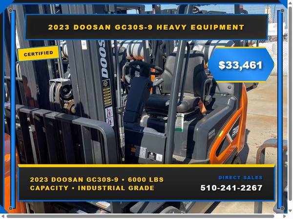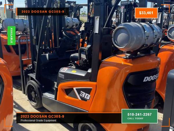 Picture 2: 2023 Doosan GC30S-9 Capacity: 6,000 lbs Fuel: LP Gas Subcategory: Cushion Tire 4 Wheel Sit Down (Indoor Warehouse) Mast Type: Three Stage Mast Height: 189 / 85 in Side Shifter: Yes Hours: 0 Condition: New Stock: 102090-22 Price: $33,461 2023 Doosan/Bobcat GC30 LPG located in Fresno CA. Best visibility on the market coupled with the best drivetrain - 2.5L Nissan LPG engine, Powershift Transmission, Oil Cooled Disc Brakes. 2 year full / 3 year powertrain warranty