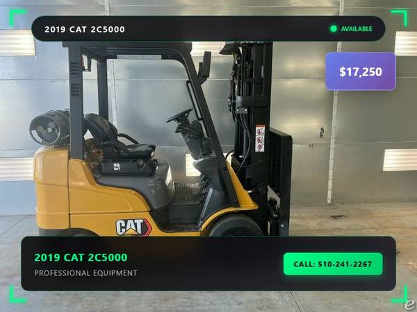 Picture 21: 2019 Cat 2C5000 Capacity: 5,000 lbs Fuel: LP Gas Subcategory: Cushion Tire 4 Wheel Sit Down (Indoor Warehouse) Mast Type: Three Stage Mast Height: 83 / 187 in Side Shifter: Yes Hours: 7,413 Condition: Used Stock: 7305-19 Price: $17,250