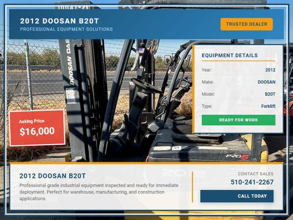 AVAILABLE UNITS: ═══════════════════════════════════════════════════════════ Picture 1: 2012 Doosan B20T Capacity: 4,000 lbs Fuel: Electric Subcategory: Electric 3 Wheel Sit Down Mast Type: Three Stage Side Shifter: No Hours: 7,880 Condition: Used Stock: 10047-21 Price: $16,000