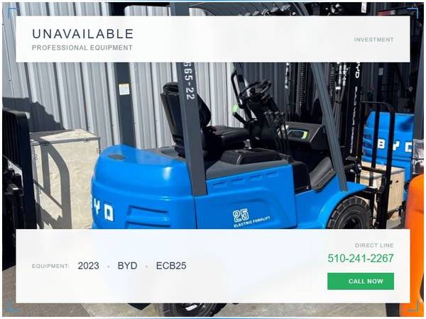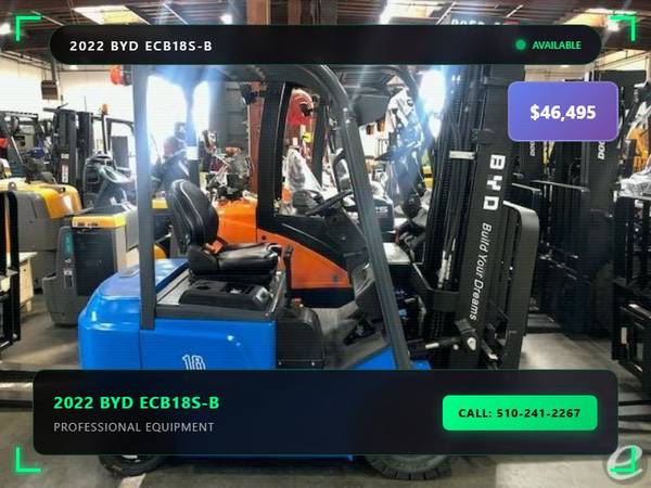 Picture 19: 2022 BYD ECB18S-B Capacity: 4,000 lbs Fuel: Electric Subcategory: Electric 4 Wheel Sit Down Mast Type: Three Stage Mast Height: 87 / 189 in Side Shifter: Yes Hours: 1 Condition: New Stock: 101441-21 Price: $46,495 FASTEST RAPID CHARGE IN THE INDUSTRY - 90 MINTUES FROM 0-100%. UNTOUCHABLE.