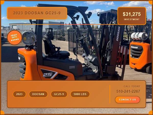 Picture 10: 2023 Doosan GC25-9 Capacity: 5,000 lbs Fuel: LP Gas Subcategory: Cushion Tire 4 Wheel Sit Down (Indoor Warehouse) Mast Type: Three Stage Mast Height: 189 / 85 in Side Shifter: Yes Hours: 0 Condition: New Stock: 102905-22 Price: $31,275 2023 Doosan/Bobcat 5,000# Capacity Cushion. Backed by Bobcat leasing - best programs on the market.