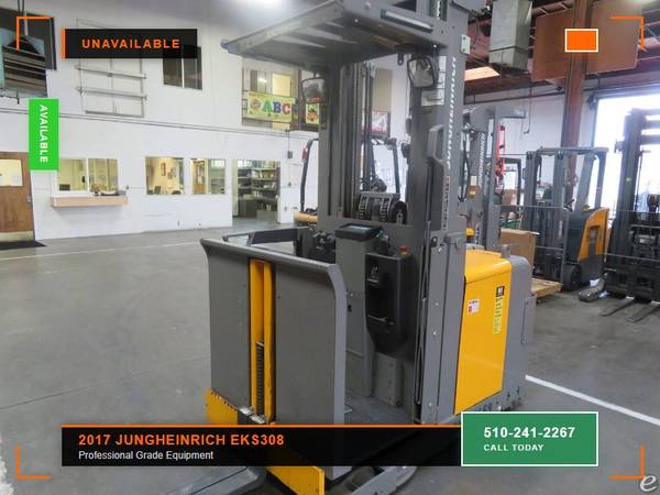 Picture 14: 2017 Jungheinrich EKS308 Capacity: 3,000 lbs Fuel: Electric Subcategory: Electric Order Picker Mast Type: Three Stage Mast Height: 109 / 236 in Side Shifter: No Hours: 857 Condition: Used/Rental Stock: 8481-20