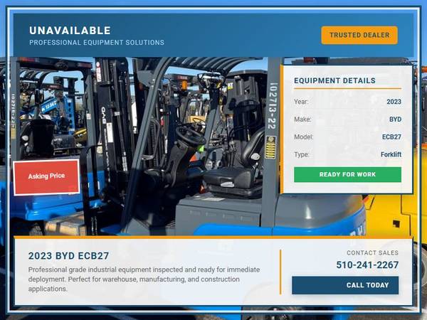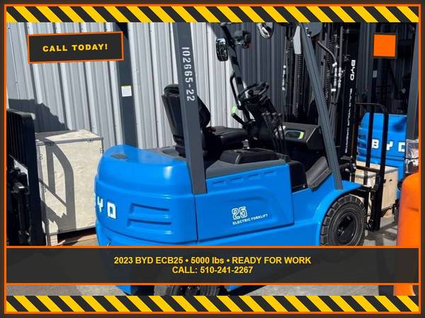 Picture 8: 2023 BYD ECB27 Capacity: 6,000 lbs Fuel: Electric Subcategory: Electric 4 Wheel Sit Down Mast Type: Three Stage Mast Height: 86 / 187 in Side Shifter: Yes Hours: 1 Condition: New Stock: 102679-22 THE FORKLIFT WITH A SINGLE DOUBLE WILL RUN 10 HOURS WITHOUT A BREAK AND CHARGE IN 90 MINUTES. ONLY REGRET IS NOT TRYING IT SOONER.