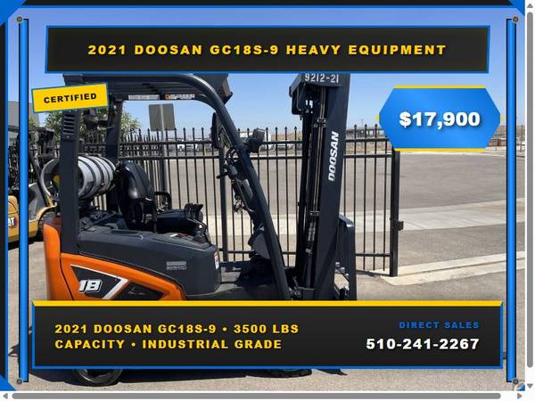 Picture 4: 2021 Doosan GC18S-9 Capacity: 3,500 lbs Fuel: LP Gas Subcategory: Cushion Tire 4 Wheel Sit Down (Indoor Warehouse) Mast Type: Three Stage Mast Height: 86 in Side Shifter: Yes Hours: 4,100 Condition: Used Stock: 900614 Price: $17,900
