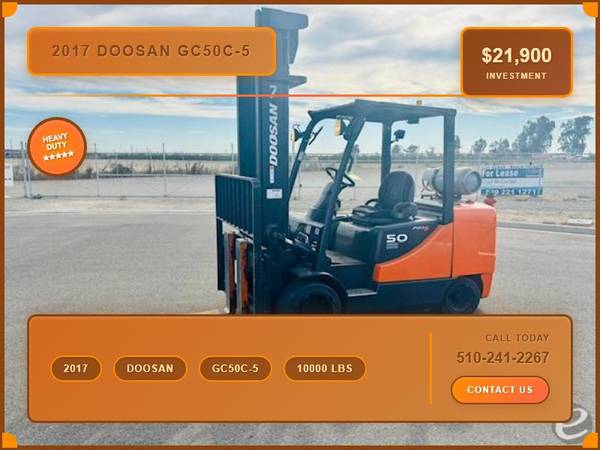 Picture 22: 2017 Doosan GC50C-5 Capacity: 10,000 lbs Fuel: LP Gas Subcategory: Cushion Tire 4 Wheel Sit Down (Indoor Warehouse) Mast Type: Two Stage Mast Height: 110 / 148 in Side Shifter: Yes Hours: 4,477 Condition: Used Stock: 105035-24 Price: $21,900