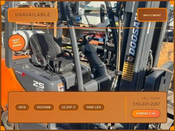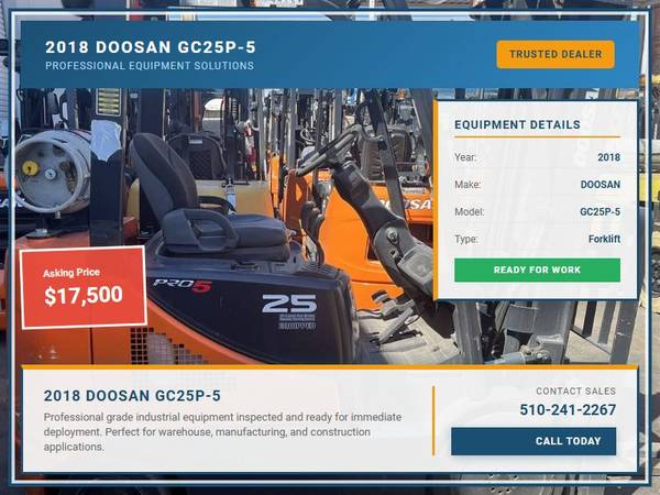 Picture 24: 2018 Doosan GC25P-5 Capacity: 5,000 lbs Fuel: LP Gas Subcategory: Cushion Tire 4 Wheel Sit Down (Indoor Warehouse) Mast Type: Three Stage Mast Height: 84 / 189 in Side Shifter: Yes Hours: 4,410 Condition: Used Stock: 7967-20 Price: $17,500