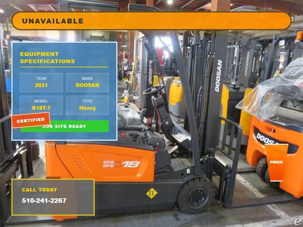 Picture 5: 2021 Doosan B18T-7 Capacity: 3,500 lbs Fuel: Electric Subcategory: Electric 3 Wheel Sit Down Mast Type: Three Stage Mast Height: 83 / 188 in Side Shifter: Yes Hours: 1 Condition: Used/Rental Stock: 8691-20