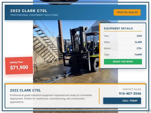 2022 Clark C70L • David • 916-407-3546 2 FORKLIFTS AVAILABLE • MULTIPLE BRANDS • 3,500 lbs to 15,500 lbs