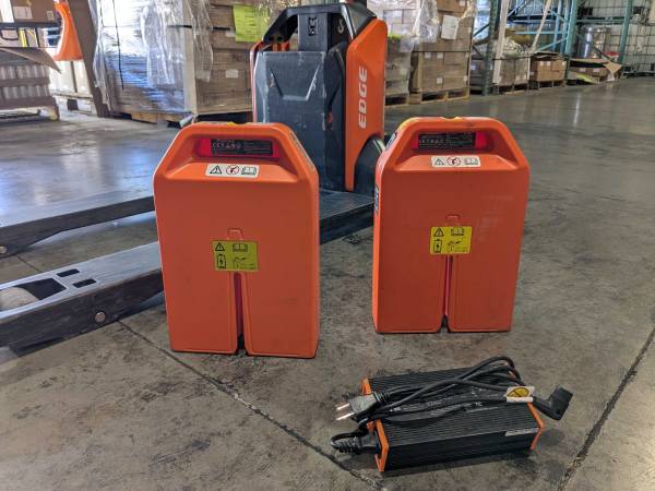 Noblelift Edge brand electric pallet truck. 3,300 lb capacity. Excellent condition. Comes with two batteries (one of them very new) and the charger. Forks 46" long, 21" width center to center of forks. 6" wide forks. Body depth only 15" so makes for ideal maneuvering in small spaces.