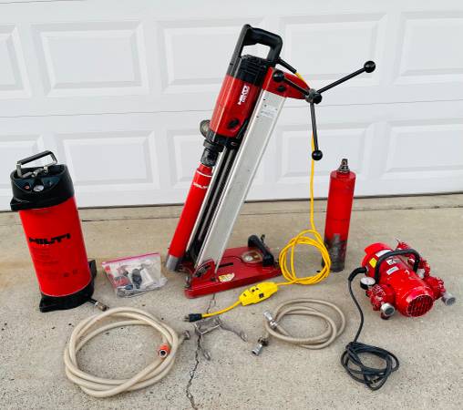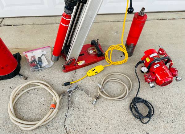 Works good. Strong and powerful core drill. Complete set. It comes with everything pump sprayer and compressor. Heavy duty stand. In great condition. Take everything as a package.
