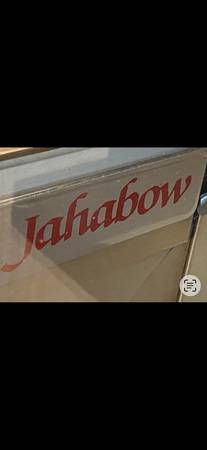 Two JAHABOW electric lighted, locking, jewelry cases for sale. They are 6 feet long. With pedestals they are 7 feet long. The pedestals are finished oak, but have been painted with semigloss black (can be removed if oak is desired).