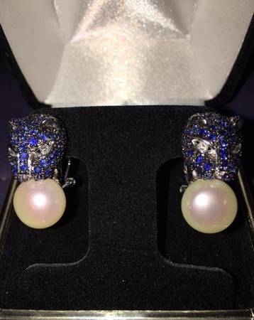Sophisticated Genuine 13mm South Sea Pearls, Diamond And Blue Sapphire Jaguar Earrings, The Natural Sapphires In Earrings Are Of Very Very Good Clarity, And Diamonds Are VS Clear And Sparkle In The Eye's/Nose Of Jaguar, These 18K White Gold Omega Earrings Are Stunning...