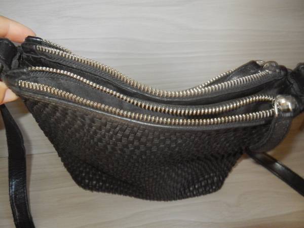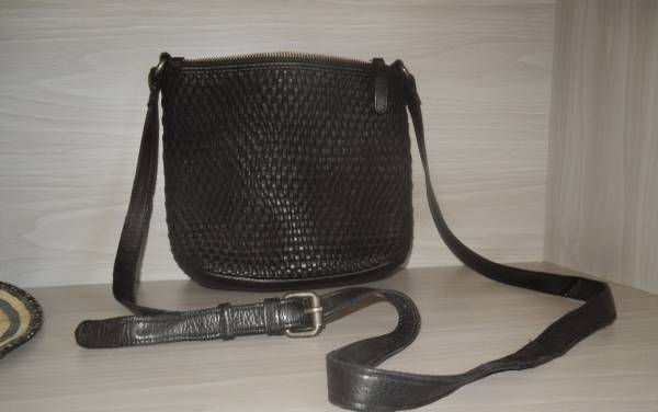 This black woven leather crossbody bag features a unique textured design, offering a stylish and modern look. Its medium size and solid black strap make it perfect for everyday use, combining practicality with a chic aesthetic. It is 10 in x 9 in. The strap drop is 23 in and can be made 3 in longer. The fabric lining is clean. Very soft leather from smoke free home.