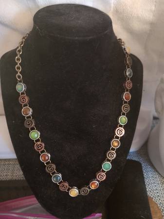 Overall, this vintage necklace and bracelet are beautiful and unique pieces of jewelry that are sure to make a statement. With its earth tone colored faceted gems, swirl links, and gem links, they are versatile pieces of jewelry that can be worn with a variety of outfits. The lobster claw clasp ensures the necklace stays securely fastened, making it a great choice for everyday wear. The bracelet is a stretch bracelet allowing anyone of any size to wear this beautiful bracelet.
