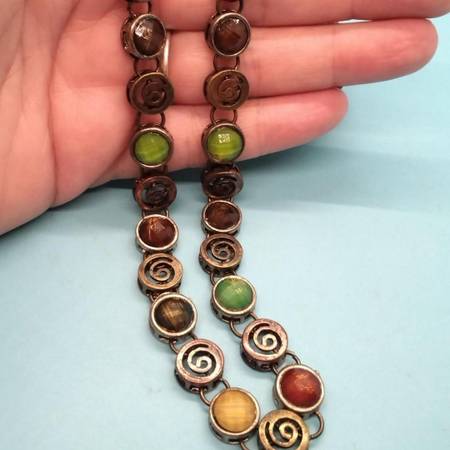 This vintage necklace and bracelet are a beautiful and unique addition to any jewelry collection. Made from durable copper links and chains, they are long-lasting and can be worn for years to come. The earth tone colored faceted gems are flush mounted into round links, adding a unique and interesting texture to the necklace. The gemstones are yellow, green, orange, and brown, and the necklace is 16 inches in length. The three-inch extender allows for a wide range of lengths to hang around the neck, making it a versatile piece of jewelry that can be worn with a variety of outfits.