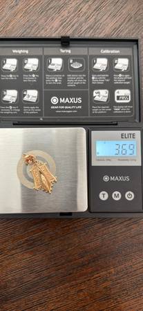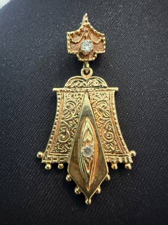 Unique bell-shaped antique 14k solid gold pendant with 2 small sparkling diamonds. Approximately 1.5” long x .75” wide. Price is very firm; not accepting offers. Meet at bank in N Natomas. Will ship...