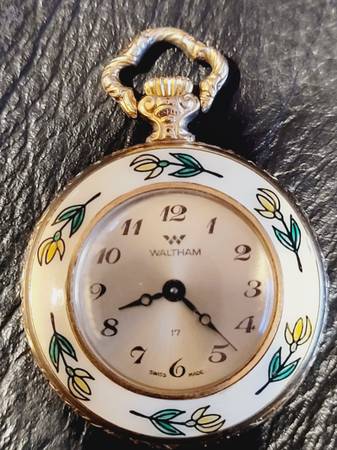 Hand Painted Ladies Enamel Hunt Scene Waltham Swiss 17 Jewel Pendant Watch Good working condition