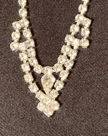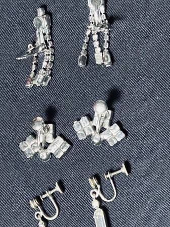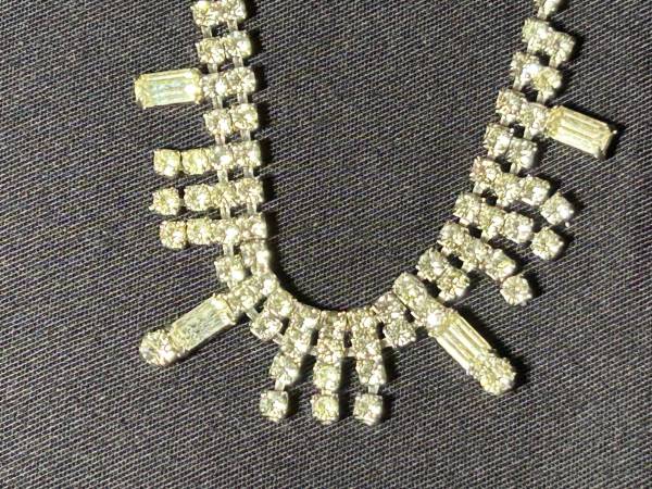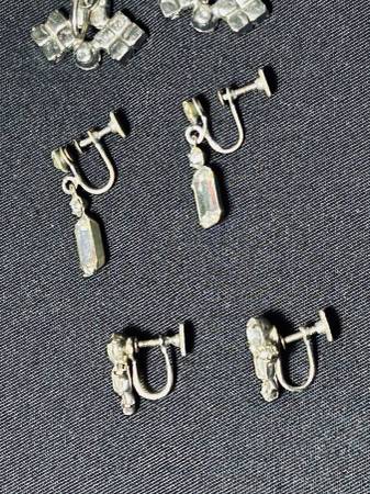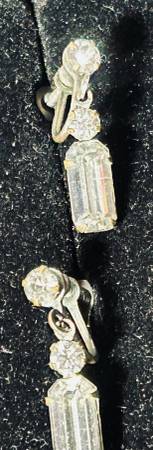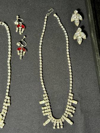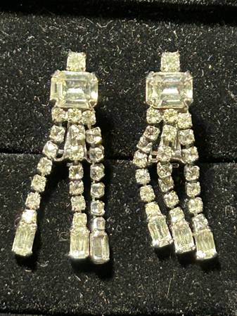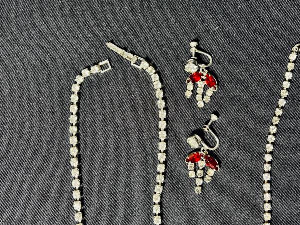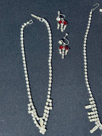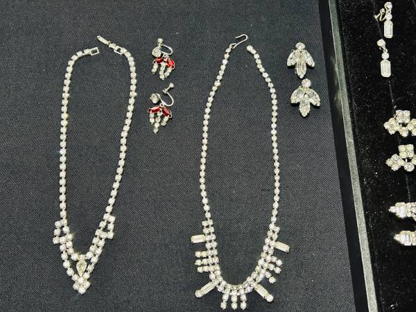BEAUTIFUL VINTAGE 1950s CLEAR RHINESTONE JEWELRY. 2 DROP NECKLACES (14" & 16"), & 6 PAIRS OF EARRINGS. ALL FOR $150