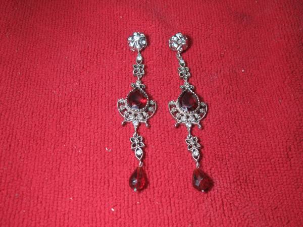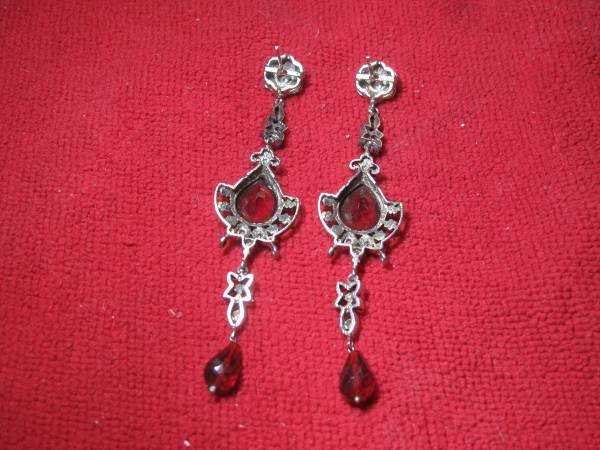 Unmarked Women's Silver earrings with Red Garnet and CZ stones? Beautiful ornate design. About 4" in length and ready for use. The bottom gems look like pomegranete nibs. Actual items you see here. They look better in person though. If interested, Text/email/call me to see. Two7nine two2four Four3four Three.