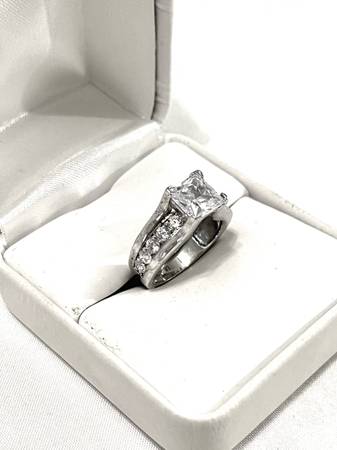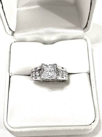Brand new princess cut cubic zirconia CZ diamonds set in a sterling silver wedding ring. Size 5.