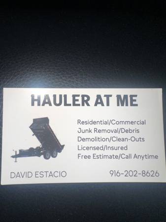 We Service Sacramento & Surrounding Areas….We Offer: Demo/Clean Outs/Junk Removal & Debris Hauling/Moving/Etc….No Job Is To Big or To Small We Are Licensed & Insured….Family Owned & Operated….Honest & Reliable….Free Quotes & Fair Prices….If You Need Me….Hauler At Me….We Would Appreciate Your Business….Ask For David