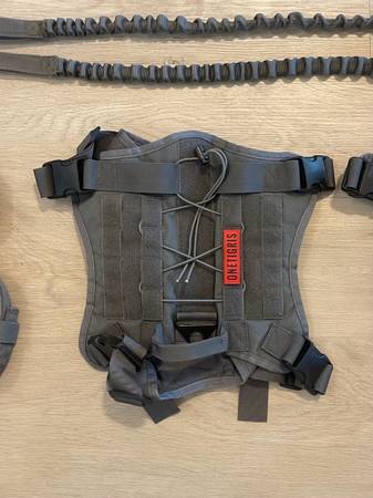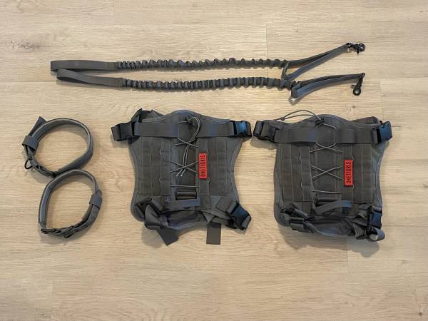 Dog Harnesses: - One Tigris Gear - For large dogs - 2 tactical dog vest - 2 bungee Leash with quick release - 2 adjustable collar - Only used a few times, like new
