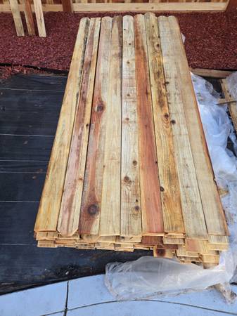 Redwood Fence Boards for sale. One side is smooth and the other side is ruff bark edges and some knots. Approximately 300 hundred at $1.00 each or $250.00 for all.